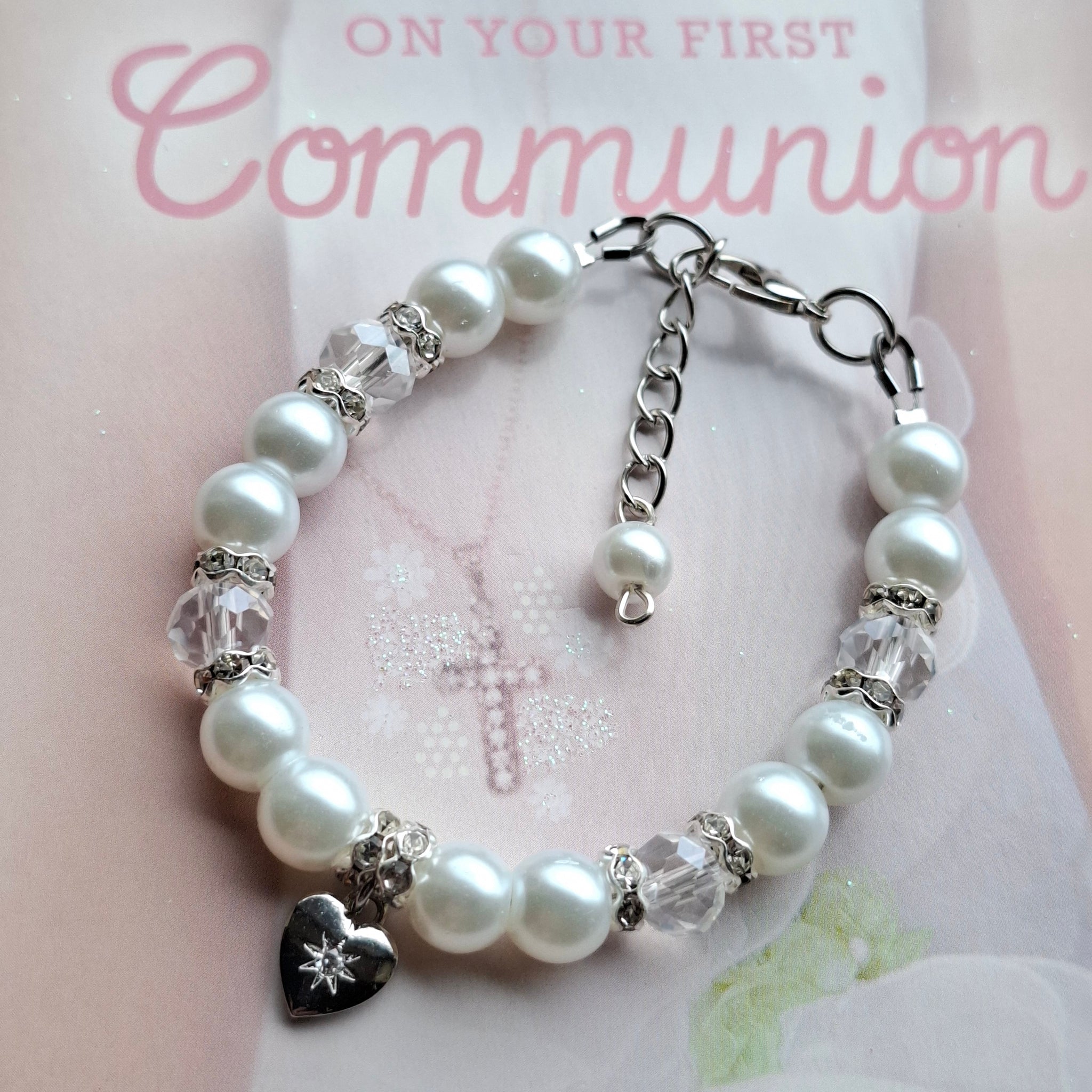 Beautiful Communion bracelet made with shell pearls with crystal beads and finished with stainless steel clasp. Featuring a beautiful silver stainless steel heart with glass crystal inset.