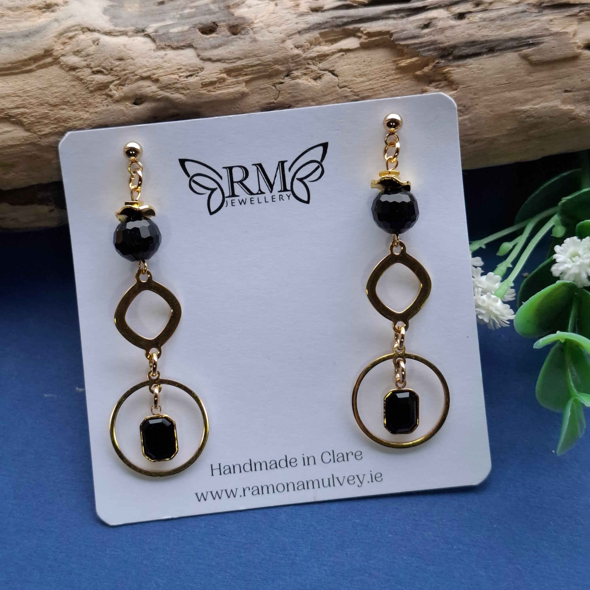 Black and gold dangly earrings. Stainless steel hoop with black crystal charm insert, stainless steel connector, black glass bead. Light weight, ideal for sensitive ears.
